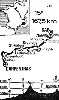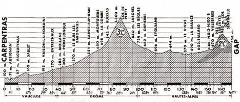 11h40 (Vaucluse) : Carpentras (km 0) - Aubignan (km 4.5) - Vacqueyras (km 10) - Sablet (km 17.5) - Roaix (km 23.5) - Vaison-la-Romaine (km 29) - Entrechaux (km 35.5) - (Drôme) : Mollans (km 41.5) - Pierelongue (km 44) - Le Buis-les-Baronnies (km 51) - Sainte-Euphémie (km 62.5) - St-Auban (km 67) - Montguers (km 69) - La Combe (km 72) - Ruissas (km 76) - Col de Perty (km 85.5-GPM3) - Laborel (km 94.5) - (Hautes-Alpes) : Les Bègues (km 99) - Orpierre (km 103.5) - Le Bachas (km 105) - Eyguians (km 111.5) - Larragne (km 117) - Le Vivas (km 133.5) - La Saulce (km 138) - Tallard (km 143.5) - Yalserres (km 154) - Jarjayes (km 159) - Col de la Sentinelle (km 161-GPM2) - Gap / Av. J. Jaurès (km 167.5).