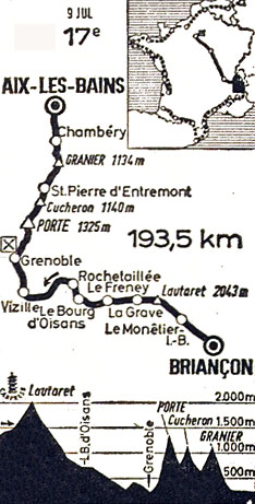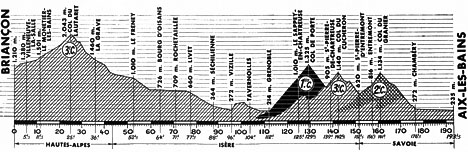 10h32 (Hautes-Alpes) : Briançon (km 0) - Saint-Chaffrey (km 2.5) - Villeneuve-la-Salle (km 5.5) - Le Monetier-les-Bains (km 11.5) - Col du Lautaret (km 25-GPM3-Souv. H.D.) - La Grave (km 26) - (Isère) : Barrage du Chambon (km 50) - Le Freney (km 52.5) - Le Clapier (km 59) - Bourg d'Oisans (km 64) - La Paute (km 66.5) - Rochetaillée (km 71) - Livet (km 77.5) - Riouperoux - Gavet - Séchilienne (km 88) - Vizille (km 96) - Brie et Angonnes (km 100.5) - Tavernolles (km 104) - Eybens (km 107) - Grenoble (km 112-ravitaillement) - Corenc - Le Sappey-en-Chartreuse (km 125.5) - Col de Porte (km 129.5-GPM1) - Saint-Pierre de Chartreuse (km 139) - Col du Cucheron (km 142.5) - Saint-Philibert (km 145.5) - Saint-Pierre d'Entremont (km 151.5) - (Savoie) : Saint-Pierre d'Entremont - Entremont-le-Vieux (km 156.5) - Col du Granier (km 161-GPM2) - Chambéry (km 176.5) - Aix-les-Bains / circ. automobile (km 193.5).