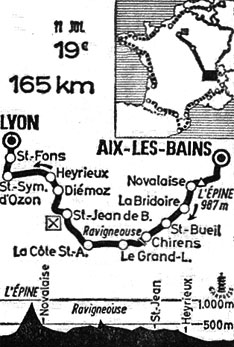 11h55 (Savoie) : Aix-les-Bains (km 0) - La Motte Servolex (km 12.5) - Saint-Sulpice - Col de l'Épine (km 24-GPM2) - Novalaise (km 32) - St-Alban-de-Montbel (km 38) - La Bridoire (km 43.5) - St-Béron (km 47.5) - (Isère) : Saint-Bueil - Champet - St-Geoire-en-Valdaine (km 56.5) - Massieu (près de) (km 60.5) - L'Arsenal - Chirens (km 65) - Côte de la Ravigneouse (km 70.5-GPM4) - Apprieu (km 71) - Colombe (km 80) - Le Grands Lemps (km 80) - Brevenais (près de) - La Frette (km 84) - Saint-Hilaire de la Côte - Gillonnay - La Côte Saint-André (km 92) - Semons (km 99) - Lieudieu (près de) - St-Jean de Bournay (km 111-ravitaillement) - Royas - Diemoz - Heyrieux (km 131) - St-Pierre de Chandieu (km 134.5) - Saint-Symphorien d'Ozon (km 147.5) - Serezin (km 152) - Feyzin (km 157) - (Rhône) : Saint-Fons (km 161.5) - Lyon / stade municipal (km 165).