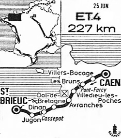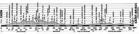 9h15 (Calvados) : Caen (km 0) - Venoix (km 4.5) - Bretteville-sur-Odon (km 6) - Verson (km 10) - Mouen (km 12) - Tourville-sur-Odon (km 13) - Mondrainville (km 14) - Les Forges (km 17) - Noyers-Bocage (km 19) - Villers-Bocage (km 26.5) - Coulvain - Benneville (km 34) - Les Haies Tigard (km 36) - Saint-Martin-des-Besaces (km 43) - La Jouannelière (km 46) - Carr. Le Poteau (km 52.5) - Les Bruns (km 53.5) - Pont-Farcy (km 60.5) - (Manche) : Côte de Pont-Farcy (km 63.5-GPM4) - Villedieu-les-Poêles (km 79.5) - Saultchevreuil du Tronchiet (km 81.5) - Rouffigny (km 84.5) - L'Epine (km 86.5) - Le Parc (km 90.5) - Les Forges (km 95) - Ponts (km 98.5) - Avranches (km 101.5) - Quenoy (km 103.5) - Pontaubault (km 108.5) - Précey (km 112) - Brée (km 118.5) - Pontorson (km 123.5) - (Ille-et-Vilaine) : Ville-Chérel (km 125.5) - Mont Rouault (km 127.5) - Baguer-Pican (km 138.5) - Dol-de-Bretagne (km 142.5-ravitaillement) - L'Abbaye (km 143.5) - Vildé-Bidon (km 148.5) - La Barre (km 151.5) - La Butte (km 154.5) - Le Vieux-Bourg (km 155.5) - (Côtes-du-Nord) : Le Val Herbelin (km 158.5) - La Croix du Frêne (km 162.5) - Saint-Piat (km 164) - Lanvallay (km 168.5) - Dinan (km 169.5) - Côte de Cassepot (km 170.5-GPM4) - Vilde Guingalan (près de) (km 177.5) - Plélan-le-Petit (près de) (km 183) - Lescouet-Jugon (près de) (km 190.5) - Jugon (km 191.5) - Trémaudan (km 198.5) - Noyal (km 204.5) - Lamballe (km 208.5) - Saint-René (km 219) - Yffiniac (km 221.5) - Langueux (km 224.5) - Saint-Brieuc / Vélodrome (km 227).
