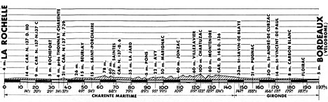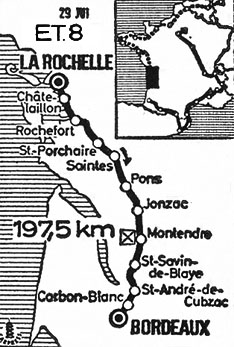 11h23 (Charente-Maritime) : La Rochelle (km 0) - Châtelaillon (km 8.5) - Les Trois-Canons - Rochefort (km 29) - Tonnay-Charente (près de) (km 34.5) - Pont-Saint-Clément (km 39.5) - Saint-Hippolyte (près de) (km 42.5) - Beurlay (km 49) - Saint-Porchaire (km 54.5) - Rulon - Mongre - Saintes (km 68.5) - La Jard - Pons (km 89.5) - Avy (km 95) - Marignac (près de) (km 99.5) - Clam (km 103.5) - Jonzac (km 109) - Carr. St-Simon (km 115) - Villexavier (km 119) - Chartuzac (km 123) - Montendre (km 129-ravitaillement) - (Gironde) : Saint-Savin-de-Blaye (km 147) - Saint-Urbain (km 153) - Pugnac (km 155.5) - Magrigne - St-André-de-Cubzac (km 166) - Cubzac-les-Ponts (km 169) - Saint-Vincent-de-Paul (km 171) - Marquet (km 174.5) - Carbon-Blanc (km 179) - Les Quatre-Pavillons (km 183) - Ploirac (km 187.5) - Pont-Saint-Jean (km 190.5) - Bordeaux / Vélodrome (km 197.5).