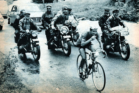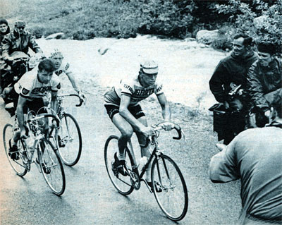 - Dans la longue montée (par Barèges) du Tourmalet, Jimenez lâche A. Desmet défaillant, tandis que derrière, André Foucher, accompagné de E. Martin, Lebaube, Simpson, Pambianco, Delisle & Portaluppi, part à la poursuite des leaders. Au sommet du Tourmalet (km 198), Jimenez est seul en tête, à 1'45" Foucher, à 3'53" Martin, à 4'02" Lebaube, à 4'30" Motta & Gimondi, à 4'45" De Rosso, Poulidor, à 5' Delisle, à 5'10" Kunde, à 5'25" Simpson etc.