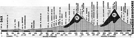 7h50 (Landes) : Dax (km 0) - Narosse - Estibeaux (près de) - Tihl (km 24.5) - (Basses-Pyrénées) : Couste (km 35) - Orthez (km 39.5) - Laa-Mondrans (km 42) - Bugnein - Bastanès (km 56.5) - Méritein - Navarrenx (km 59.5) - Sus - Geus (km 65) - Geus d'Oloron - Saint-Goin (km 71.5) - Géronce (km 72.5) - Orin - Oloron-Sainte-Marie (km 81.5-ravitaillement) - Herrère-de-Bas (km 88.5) - Ogeu-les-Bains (km 92.5) - Buziet (km 94.5) - Buzy (km 96) - Arudy (km 100) - Ezeste - Bielle (km 106) - Belestein (km 108.5) - Monplaisir (km 110) - Laruns (km 113.5) - Eaux-Bonnes (km 115.5) - Col d'Aubisque (km 131.5-GPM1) - (Hautes-Pyrénées) : Col de Soulor (km 141.5) - Arrens (km 149.5) - Marsous (km 151.5) - Aucun (km 152.5) - Arras-en-Lavedan (km 158.5) - Argelès-Gazost (km 161.5) - Pierrefitte-Nestalas (km 168-ravitaillement) - Luz Saint-Sauveur (km 179.5) - Barèges (km 187) - Col du Tourmalet (km 198-GPM1) - La Mongie (km 203) - Gripp (km 210.5) - Sainte-Marie-de-Campan (km 214.5) - Campan (km 221) - Beaudéan (près de) (km 222) - Bagnères-de-Bigorre / Allée J. Jaurès (km 226.5).