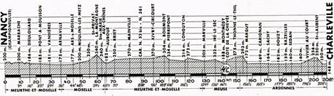 Frouard (km 4) - Pompey - Marbache (km 9) - Belleville (km 12) - Dieulouard (km 16) - Blénod les Pont-à-Mousson (km 20) - Pont-à-Mousson (km 23) - Vandières (km 29) - Pagny sur Moselle (km 32.5) - Arnaville (km 36) - (Moselle) : Novéant sur Moselle (km 38) - Ars sur Moselle (km 44) - Moulins-les-Metz (km 48.5-sprint) - Châtel Saint-Germain (km 51) - Amanvillers (km 57.5) - St-Privat la Montagne (km 59.5) - Ste-Marie aux Chênes (km 62.5) - (Meurthe-et-Moselle) : Auboué (km 55.5) - Moutiers - Briey (km 71) - Mainville (km 76.5) - Xivry-Circourt (km 96) - Mercy le Bas (km 100) - Boismont (km 103) - Pierrepont (km 106) - Longuyon (km 116.5) - (Meuse) : Marville (km 129) - Iré le Sec (km 136) - Montmédy (km 141.5-ravitaillement) - Côte de la Chevée (km 142.5-GPM4) - Thonnelle (km 147) - Thonne le Thil (km 149.5) - (Ardennes) : Montlibert - Margut (km 156.5) - Linay (km 161) - Blagny - Carignan (km 165.5) - Sachy (km 170.5) - Pouru-St-Rémy - Douzy (km 177.5) - Bazeilles (km 182) - Balan - Sedan (km 185.5) - Floing (km 188.5) - Vivier au Court (km 196.5) - Ville sur Lumes - Saint-Laurent (km 202.5) - Montcy-St-Pïerre (km 205.5) - Charleville / Cours Aristide Briand (km 208.5).