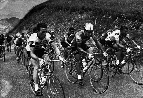 Le peloton des favoris ne s'inquiète pas trop : Pingeon, Poulidor, Anquetil de gauche à droite.
