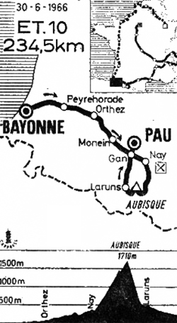 - Dans la descente Diaz revient sur les deux leaders. A l'arrière un groupe d'une vingtaine d'hommes s'est formé à la poursuite du trio de tête. A 20 km du but, Diaz est lâché sur ennui mécanique. A 10 km de Pau, In't Ven et De Pra passent avec 1'15" sur Diaz, 1'30" sur le groupe de chasse et 7' sur le peloton des vedettes. Au sprint De Pra gagne facilement devant le jeune Belge. Il faudra attendre plus de 9' pour voir arriver le peloton avec un Poulidor, piégé et mal inspiré, qui compte au général plus de 7' de retard sur un sérieux client : Lucien Aimar, coéquipier d'Anquetil mais aussi sur Jan Janssen. Tomasso De Pra crée la surprise en enfilant le maillot jaune de son co-équipier Altig.