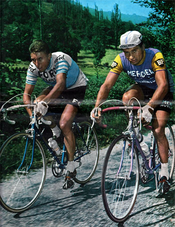 Le public fait savoir par quelques banderoles à Poulidor et Anquetil qu'il est temps qu'ils s'intéressent à la course et dépassent les querelles individuelles.