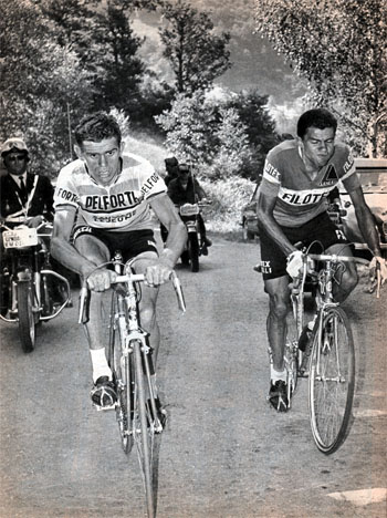 - Dans le col de Mente, il règne une chaleur accablante. Den Hartog et Wolfshohl faiblissent puis Bitossi disparait également du groupe de tête avec Schleck, Esteban, Martin, Sels, Colombo ainsi que Gonzalez sur crevaison. Derrière Anquetil et Poulidor collaborent pour réduire l'avance des attaquants et mettent en difficulté De Pra, Brands, Echevarria, Huysmans et Simpson ainsi qu'Aimar retardé par une chute. Au col de Mente (km 138.5) : en tête Galera, à 15" Jimenez, à 20" San Miguel, à 35" Pingeon, Delisle, à 1'20" Poulidor, R. Altig & Anquetil etc. De Pra est pointé à 5'.