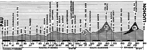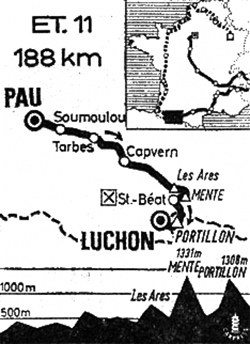 10h40 (Basses-Pyrénées) : Pau (km 0) - Idron (km 3.5) - Ousse (km 6.5) - Soumoulou (km 14) - Ger (km 25.5) - (Hautes-Pyrénées) : Tarbes (km 37) - Barbazan-Debat - Piétat (km 44) - Angos (km 45.5) - Bordes (km 52) - Tournay (km 54.5) - Ozon (km 56) - Ricaud - Gourgue (km 60) - Capvern-les-Bains (km 64) - Lhez - Capvern (km 67-sprint) - Avezac - La Barthe-de-Neste (km 73.5) - Escala (km 75.5) - Tuzaguet (km 78.5) - Anères (km 80.5) - Aventignan (km 86.5) - (Haute-Garonne) : St-Bertrand-de-Comminges (près de) (km 94) - (Hautes-Pyrénées) : Izaourt (km 96.5) - Galiè (près de) (km 101) - Ore (km 104) - Col des Ares (km 111-GPM3) - Cazaunous (près de) (km 117) Juzet d'Izaut - Col de Buret - Henne-Morte (km 128) - Col de Mente (km 138.5-GPM2) - Boutx (km 145.5) - Saint-Béat ( km 148-ravitaillement) - Arlos (km 151) - Fos (km 154.5) - Seriail (km 156) - Pont-du-Roi (km 159) - (ESPAGNE) - Les (km 164.5) - Bosost (km 169) - Col du Portillon (km 177.5-GPM1) - (FRANCE) - (Haute-Garonne) : Saint-Mamet (km 186.5) - Luchon / Pl. Lezat (km 188).