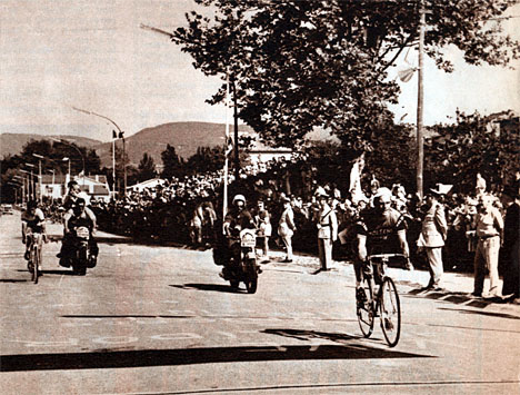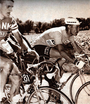 Dans le col de Portet d'Aspet, le "petit" Kunde (1m55), futur maillot jaune, aux côtés d'Anquetil.