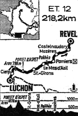 - Après un début de course nerveux, tout le monde est groupé au pied du col des Ares, petit col de 3ème catégorie. Au sommet (km 27), le peloton est étiré mais complet, mené dans l'ordre par Bitossi, Grain, Galera & Jimenez. La chaleur se fait de plus en plus accablante lorsque la course aborde le col du Portet d'Aspet. Ce sont Jimenez et Galera qui assurent le train et le peloton se fractionne. Au sommet de ce col (km 49), Jimenez passe en tête, à 5" Vandenbossche, à 10" Galera, à 15" San Miguel, Gabica, Poulidor & Gonzalez, à 20" Mugnaini, Anquetil, Janssen, Delisle, Haast Momene, Huysmans, Aimar, Kunde et le maillot jaune Lebaube. Le peloton se regroupe dans la descente.