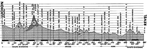 10h15 (Haute-Garonne) : Luchon / gare (km 0) - Moustajon (km 2) - Antignac (km 3) - Pont de Cazaux (km 8) - Cierp (km 14) - Pont de Chaum (km 17) - Fronsac (km 19) - Col des Ares (km 27.5-GPM4) - Cazaunous (près de) (km 33.5) - Juzet-d'Izaut (km 36.5) - Col de Buret (km 37.5) - Heune-Morte (km 44) - Col de Portet-d'Aspet (km 49-GPM2) - Portet-d'Aspet (km 51) - (Ariège) : Saint-Lary (km 55) - Augirein (près de) (km 56.5) - Orgibet (km 58.5) - Illartein (km 60.5) - Aucazein (km 61.5) - Argein (km 63.5) - Audressein (km 67) - Engomer (km 70.5) - Luzenac (km 73) - Moulis (près de) (km 74.5) - Saint-Girons (km 79-sprint) - Lescure (près de) (km 87.5) - Clermont (km 95.5) - Le Saret (km 98.5) - Maury (km 99.5) - Le Mas d'Azil (km 103) - Sabarat (km 108.5) - Menay (km 113) - Pailhès (km 116) - Pal de Pailhès (km 120.5-GPM4) - Pamiers (km 133.5-ravitaillement) - Salvayre (km 139) - Le Vernet (km 142) - Mazères (km 150.5) - (Aude) : Molandier (km 153.5) - La Louvière, Louraguais (près de) (km 158) - Castelnaudary (km 182.5) - Peyrens (km 187.5) - (Haute-Garonne) : St-Ferréol (km 201) - Revel / 1er passage (km 208) - Revel / Bd. Jean-Jaurès (km 218.2).