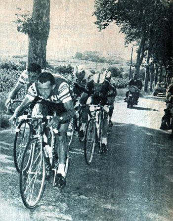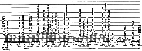 - Pas grand'chose de notable pendant les deux premières heures de course si ce n'est un vent contraire très fort, deux "aller-retour" de Jacques Anquetil pour un changement de roue et le sprint victorieux de Neri au point-chaud de Mazamet (km 38.5). Au km 78, Gines Garcia et Neri tentent l'aventure... qui ne dure que 2 km. Ils sont repris et la "chasse à la canette" reprend de plus belle car il fait très chaud. Au ravitaillement de Bédarieux (km 117.5), les 119 coureurs sont ensemble avec un retard de 25' sur l'horaire le plus pessimiste et on note une chute d'Errandonea. Il réintégrera le peloton, après quelques soins, dans la côte de Carlencas (km 125.5). C'est Jimenez qui franchit cette côte en tête malgré un démarrage un peu plus bas de Darrigade, Grain, Carlesi & Milesi.