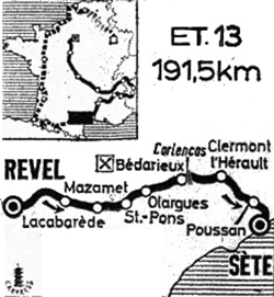 11h09 (Haute-Garonne) : Revel (km 0) - (Tarn) : Sorèze (km 5) - Dourgne (km 12.5) - Verdalle - Labruguière (km 27.5) - Saint-Alby (km 36) - Mazamet (km 38.5-sprint) - La Richarde (km 39.5) - Saint-Amans-Soult (km 48) - Lacabarède (km 56) - Labastide-Rouairoux (km 62) - (Hérault) : Courniou (km 68.5) - Saint-Pons (km 73.5) - Riols (km 77.5) - Le Mas du Moulin - Prémian - Ichis (près de) (km 82.5) - St-Étienne-d'Albagnan (km 85.5) - Olargues (km 91.5) - Carr. La Trivalle (km 97.5) - Colombières-sur-Orb - Le Poujol-sur-Orb (km 107.5) - Lamalou-les-Bains (près de) (km 109.5) - Hérépian (km 112.5) - Bédarieux (km 117.5-ravitaillement) - Côte de Carlencas (km 125.5-GPM4) - Clermont l'Hérault (km 147.5) - Canet (km 153.5) - Plaissan (km 159.5) - Villeveyrac (km 170.5) - Poussan (km 178.5) - Balaruc (km 182) - Le Vieux - La Peyrade (km 187.5) - Sète / Av. Victor Hugo (km 191.5).