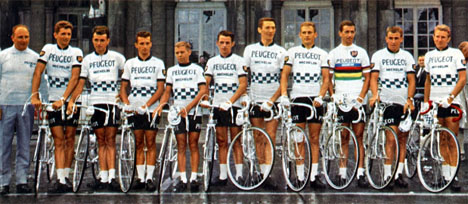 L'équipe Peugeot-BP avec le champion du monde Tom Simpson (photo Miroir du Cyclisme n° 74 de juillet 1966)