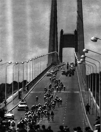 Le peloton sur le majestueux Pont de Tancarville (ouvert en 1959)