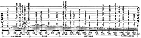 9h25 (Calvados) : Caen (km 0) - St-Martin de Fontenoy (km 5.5) - May sur Orne - Laizé la Ville (km 9) - St-Laurent de Condel - Croisilles (km 17) - Thury-Harcourt (km 21) - Courmont sur Orne - Saint-Rémy (km 30.5) - Clécy (km 33.5) - Côte de Bellevue (km 36.5-GPM4) - St-Denis de Méré - Condé sur Noireau (km 42) - (Orne) : Le Pont de Véré (km 49.5) - Flers (km 54) - La Chapelle-au-Moine (km 58) - La Crétine (km 60) - Le Chatellier (km 62) - St Bômer les Forges - Domfront (km 74) - Céaucé (km 82) - Le Bordage (km 89) - (Mayenne) : Ambrières le Grand (km 98) - La Haie Traversaine (km 101) - Mayenne (km 109-sprint) - Moulay (km 114) - Martigné (km 123) - Louverné (km 132) - Niafles (km 134.5) - Laval (km 139-ravitaillement) - L'Huisserie (km 144) - Entrammes (km 151.5) - Château-Gontier (km 171.5) - L'Aillerie - (Maine-et-Loire) : La Haie - Peuvignon - Le Lion d'Angers (km 193.5) - Grieul - La Mambrolle sur Longuenée (km 201.5) - Avrillé (km 210.5) - Angers / Av. Jean Joxé (km 216.5).