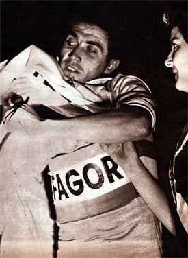 Raymond Poulidor en tête pratiquement jusqu'au bout. Errandonea, dernier Espagnol à partir, le bat de 6" et le prive de ce qui aurait été son premier maillot jaune ! L'Espagnol n'est pas un inconnu, il est champion d'Espagne de poursuite depuis 2 ans.