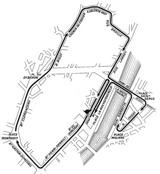 19h45 (Maine-et-Loire) : Angers / Pl. de La Rochefoucauld (km 0) - Place Monprofit (km 1.6) - Place Docteur-Michou (km 2.4) - Rue Valentin-Hauy (km 2.8) - Carr. rue Braille-rue Larrey (km 3.6) - Pont de la Haute-Chaîne / 1er pass. (km 4.2) - Virage Cointreau (km 4.6) - Pont de la Haute-Chaîne / 2ème pass. (km 5.3) - Place La Rochefoucauld (km 5.775).