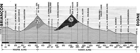 - Dans l'ascension du col, Georges Chappe sort du peloton et s'en va pour une longue échappée solitaire. Au col de Vars (km 52), Chappe est en tête, à 2' Jimenez, Aranzabal & Vicentini, à 2'05" la tête du peloton. Le "Bleuet" ne se désunit pas et accroît son capital : 5'40" puis 13'05" au pied du col d'Allos. Derrière, dans les pentes d'Allos, Lucien Aimar attaque et Mariano Diaz se lance à sa poursuite. Au sommet (km 102), Chappe est en tête, à 8'45" Aimar, à 9'50" Diaz, à 11'40" Jimenez et le reste.
