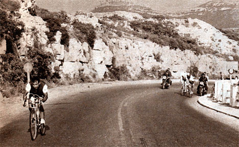 L'instant décisif, Raymond Riotte lâche ses compagnons dans le col de la Gineste (327 m) avant la plongée sur Marseille. (photo Miroir-Sprint n° 1102A du 17 juillet 1967).