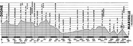 11h05 (Basses-Alpes) : Digne (km 0) - Châteauredon (km 11.5) - Mezel (km 14) - Estoublon (km 22) - La Bégude-Blanche (km 25.5) - Puimoisson (km 34.5) - Moustiers-Sainte-Marie (km 48) - Pont-d'Aiguines (km 54) - (Var) : Les Salles (km 58) - Aups (km 79) - Sillans-la-Cascade (km 88) - Cotignac (km 94) - Carcès (km 101) - Cabasse (km 112) - Besse-sur-Issole (km 124.5-ravitaillement) - Sainte-Anastasie (km 129) - Forcalqueiret (km 133.5-sprint) - Garéoult (km 136.5) - Méounes (km 144.5) - D2. Carr. Beaupré (km 150.5) - Signes (km 154.5) - Le Camp-du-Castellet (km 164.5) - (Bouches-du-Rhône) : Roquefort-Ia-Bédoule (km 179) - La Bédoule (km 184.5) - Col de la Gineste (km 197.5-GPM4) - Carr. Le Redon (km 203.5) - Marseille / stade-vélodrome (km 207.5).