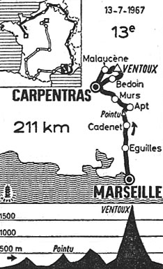 - Peu après le départ, un chien errant provoque la chute grave de Muganini et de Peffgen. Les deux coureurs souffrent de fractures multiples et sont évacués par hélicoptère vers Marseille. A Bédoin (km 151.5), au pied du Ventoux, Goyeneche et Elorza abandonnent. Après Bédoin, le peloton aborde les pentes les plus rudes et à 15 km du sommet, Poulidor attaque avec Jimenez et pendant un court moment Castello dans la roue. Il leur faut plusieurs accélérations pour qu'enfin ils se dégagent à 9 kilomètres du sommet. Le premier groupe de poursuite est constitué par Pingeon, Gimondi, Janssen & Balmamion, le second par Ventura Diaz, Puschel, Letort, Aimar & Simpson. A 5 kilomètres du sommet, Jimenez lâche Poulidor. Le Français est rejoint par Pingeon, Gimondi, Balmamion et Janssen. A 2 km du sommet, Tom Simpson est victime d'une terrible défaillance. Il zizague, s'affaisse sur son vélo et tombe dans un état comateux. Il est évacué, lui aussi, par hélicoptère. Rien de pourra le ranimer. Tom Simpson décède à l'hôpital d'Avignon à 17h40.