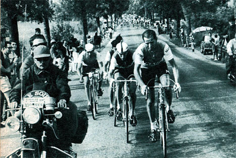 Au km 192, Gimondi, Huysmans, Karstens et Aranzabal sont partis mais le peloton réagit vivement et ne leur laissera pas plus de 6". (photo Miroir-Sprint n° 1100 B du 6 juillet 1967).