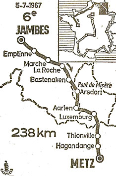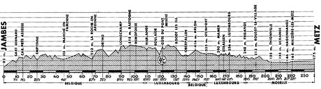 10h35 (BELGIQUE) - Jambes (km 0) - Sart-Bernard (km 9.5) - Carr. près Assesse (km 14.5) - Emptinne (km 25.5) - Marché-en-Famonne (km 46) - Carr. aux Tombes (km 49) - La Roche-en-Ardenne (km 57.5) - Ortho (km 75.5) - Bertogne (km 85.5) - Longchamps (km 89.5) - Bastogne (km 96.5) - Remefosse (km 101) - Lutrebois (km 102.5) - Lutremange (km 106.5) - (LUXEMBOURG) - Harlange (km 109.5) - Poteau d'Harlange (km 113.5) - Boulaide (km 116) - Côte du Pont Misère (km 121.5-GPM4) - Arsdorf (km 122.5) - Carr. Koetschette (km 125) - Roodt-les-Ell (km 132) - Colpach-Haut - Colpach-Bas (km 136) - Oberpallen (km 139.5) - (BELGIQUE) - Frassem - Arlon (km 146.5-ravitaillement) - (LUXEMBOURG) - Steinfort (km 155) - Capellen (km 161) - Mamer (km 164.5) - Strassen (km 168) - Luxembourg (km 172.5) - Frisange (km 184.5) - (FRANCE) - (Moselle) : Evrange (km 185.5) - Roussy-le-Village (km 192) - Hettange-Grande (km 198.5) - Manom (km 203.5) - Thionville (km 204.5-sprint) - Uckange (km 211.5) - Richemont (km 214) - Mondelange (km 216) - Hagondange (km 217) - Talange (km 218) - Maizières-les-Metz (km 221) - Metz / Bd. Poincaré (km 238).