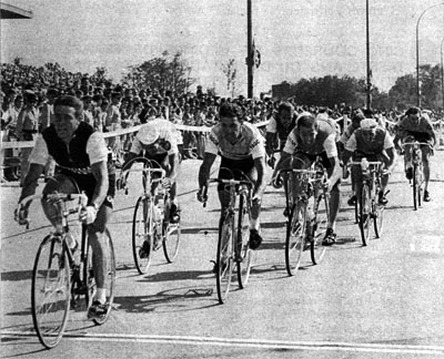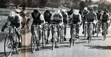 Le groupe d'échappés, à 20 km de l'arrivée. Lebaube mène vigoureusement devant Reybrouck le futur vainqueur. Simpson et Pingeon sont également aux premiers rangs (photo Miroir des Sports n° 1192 du 13 juillet 1967).