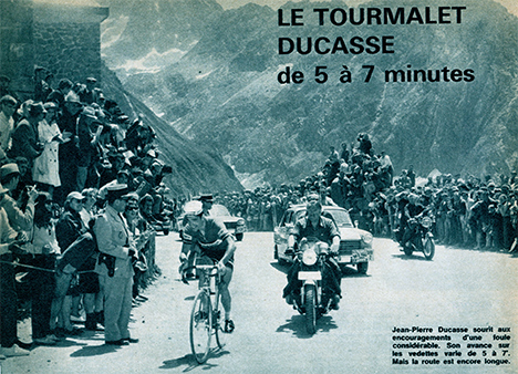 Jean-Pierre Ducasse, le grand bonhomme de la journée, caracole en tête au sommet du Tourmalet devant une foule énorme et sous un soleil écrasant (photo Miroir-Sprint n°1149B du 12 juillet 68).
