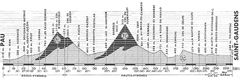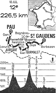 9h10 (Basses-Pyrénées) : Pau (km 0) - N134 Gan (km 6.5) - N134bis Rebenacq (km 14.5) - Sévignac-Meyracq (km 21) - Louvie-Juzon (km 24.5) - Bielle (km 28) - Belesten - Monplaisir - Laruns (km 35.5) - N134bis Carr. N618 (km 37.5) - N618 Les-Eaux-Bonnes (km 41.5) - Col d'Aubisque (km 53.5-GPM1) - (Hautes-Pyrénées) : Col de Soulor (km 63.5) - Arrens (km 71.5) - Marsous- Aucun (km 74.5) - Arras-en-Lavedan (km 80.5) - Argelès-Gazost (km 83.5) - N21 Pierrefitte-Nestalas (km 90-ravitaillement) - N21 Carr. D12 (km 99.5) - Luz-Saint-Sauveur (km 101.5) - N618 Barèges (km 109) - Col du Tourmalet (km 120-GPM1) - Gripp (km 132.5) - Sainte-Marie-de-Campan (km 136.5) - N135 Saint-Roch - Campan (km 143) - Baudéan (près de) (km 144) - Bagnères-de-Bigorre (km 148.5-ravitaillement) - N638 Carr. Manse (km 151) - Bosse-du-Hailla (km 155) - Courrèges (km 161.5) - D14 Bonnemazon (km 162.5) - Bigorre (près de) (km 164) - Espèche (km 170) - Lomne (km 172) - D14 Carr. D26 (km 173.5) - D26 Col de Coupe (km 177-GPM3) - D26 Carr. N129 (km 180) - N129 Pénart - Izaux - La-Barthe-de-Neste (km 186.5) - N638 Escala (km 188.5) - Tuzaguet (km 19/1.5) - Anères (près de) (km 193.5) - D26 Nestier (près de) (km 195.5) - Aventignan (km 199.5) - (Haute-Garonne) : Saint-Bertrand-de-Comminges (près de) (km 207) - D122 Loures-Barousse (km 210.5) - (Haute-Garonne) : D33d Barbazan (km 212.5) - D26 Sauveterre-de-Comminges (km 217-sprint) - D9 Valentine (km 224.5) - D8 Saint-Gaudens / Bd. des Pyrénées (km 228.5).