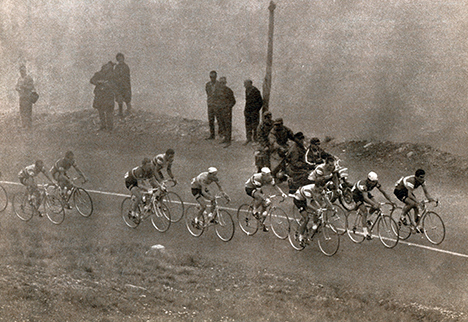 Dans la brume d'Envalira, Schiavon mène les favoris devant Poulidor, puis Gonzalez et Lopez Carril... (photo Miroir-Sprint n°1150A du 16 juillet 68).