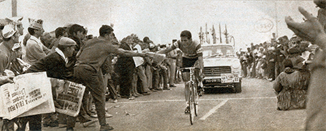 Aurelio Gonzalez passe le sommet en tête et prend un journal pour se préserver du froid dans la descente (photo Miroir-Sprint n°1150A du 16 juillet 68).