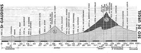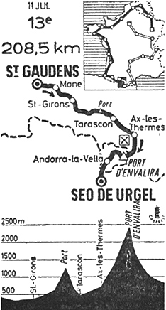- Ax-les-Thermes (km 126) marque le bas du Port d'Envalira et les Belges haussent le rythme dans l'ascension à la pente assez moyenne (5 à 6%). A 16 km du sommet, le maillot jaune et Bracke règlent l'allure. A 10 km, dans la brume, le froid est vif et une banderille de Jimenez est tout de suite contrée par Poulidor. Aux 8 km, Poulidor crève mais il est dépanné à vitesse record, perd à peine 100 mètres et rejoint sans problème. A 5 km du col (km 157, Pas de la Case), Aurelio Gonzalez met le feu dès le passage en Andorre et provoque la formation d'un groupe avec tous les favoris sauf Aimar qui a lâché, puis le maillot jaune Vandenberghe décroche mais s'accroche. Aux 1000 mètres, 20" devant le groupe de chasse, Gonzalez monte à un rythme élevé, sans se retourner dans la partie finale plus pentue. Au Port d'Envalira (km 160), les positions sont les suivantes : Gonzalez en tête, à 45" un groupe d'une quinzaine d'hommes mené par Bitossi, Poulidor, Jimenez, Gomez del Moral, San Miguel, Bayssière, Gandarias, Colombo, Lopez Carril mais aussi Schiavon, Pintens, à 1'10" Pingeon, Kunde, Puschel, Bayssière & Colombo, à 2' un groupe comprenant Aimar, Grosskost, Bellone, à 2'10" Vandenberghe, Van Springel, Wolfshohl etc., à 3'30" Godefroot.