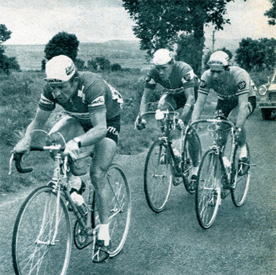 Spuhler et Genet se sont détachés dans la descente de Puy-Mary. Ils seront rejoints par Chappe. Le trio (ici emmené par Spuhlerà ira jusqu'à Saint-Étienne (photo Miroir-Sprint n°1150B du 19 juillet 68).