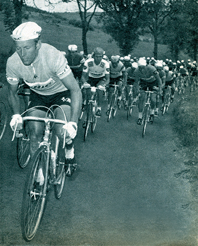 Rolf Wolfshohl, le nouveau maillot jaune qui a mis fin au long règne de Vandenberghe. Il emmène le peloton derrière les échappés (photo Miroir-Sprint n°1150B du 19 juillet 68).