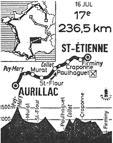 - Au km 44, Genet et Spuhler se détachent. Ducasse, Elorza et Colombo leur donnent la chasse, sans succès. Au km 50 lers fuyards ont 55" d'avance. Chappe s'élance à son tour et parvient à faire la jonction avec le duo au km 64 alors que le peloton est pointé à 1'05". A partir de là, l'écart prend des proportions plus larges. Au km 81.5, à Saint-Flour, il est de 8' puis de 11'15" au km 106. Genet perce mais ses deux compagnons l'attendent et on apprend l'abandon de Metcalfe dans la côte de Collat où Chappe passe le sommet en tête (km 146.5) avec 10" d'avance sur Spuhler et Genet. Le peloton n'arrive que 17' plus tard.
