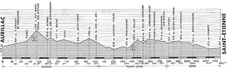 9h15 (Cantal) : Aurillac (km 0) - D17 Saint-Simon (km 4) - Rouffiac (km 7) - Volzic (km 10.5) - Jaulhac (km 12.5) - Lascelle (km 14) - Saint-Cirgues-de-Jordanne (km 14.5) - Saint-Julien-de-Jordanne (km 22) - Mandailles (km 23.5) - Rudes (km 26.5) - Puy-Mary/Pas-de-Peyrols (km 36.5-GPM3) - N680 Col d'Eylac (km 38) - N680 Carr. D62 (km 41) - Le Grandilhon (km 43) - Lavigerie (km 45) - Dienne (km 48.5) - Le Cheumeil (km 51) - Col d'Entremont (km 52) - La Chavade (km 54.5) - Murat (km 58.5-CV) - N126 Ussel (km 67) - Roffiac (km 76.5) - Saint-Flour (km 81.5) - N590 Le Vernet (km 84.5) - N590 Carr. D50 (km 86.5) - Sistrières (km 94.5) - N590 Carr. D13 (km 95.5) - N590 Carr. D601 (km 101.5) - (Haute-Loire) : D4 Chastel (km 104.5) - Saint-Cirgues (km 119.5) - N585 Lavoute-Chilhac (km 120.5) - D4 Carr. D21 (km 126) - D4 Carr. N102 (km 132.5) - N102 Carr. D641 Le Marcet (km 133.5) - D641 Paulhaguet (km 134.5-ravitaillement) - D22 Chassagnes (km 136.5) - Côte de Collat (km 146.5-GPM3) - Saint-Pal-de-Senouire (km 152) - Bonnefons (km 154.5) - Sembadel (km 155.5) - Sembadel / Gare (km 159.5) - N106 Chamborne (km 161) - N498 Fontannes (km 164.5) - Jullianges (km 166.5) - Craponne-sur-Arzon (km 172.5-sprint) - Pontempeyrat (km 178.5) - (Loire) : Les Fonds (km 180) - Usson-en-Forez (km 185.5-CV) - Estivareilles (km 193.5) - Saint-Bonnet-le-Château (km 199.5) - D3 La Tourette (km 201.5) - Montcoudiol (km 206.5) - Saint-Maurice-en-Gourgois (km 211.5) - Gourgois (km 213) - Le Pertuiset (km 218.5) - Firminy (km 223.5) - N88 Le Chambon-Feugerolles (km 227) - La Ricamarie (km 230.5) - Saint-Étienne / Cours Fauriel (km 236.5).