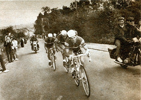 Erik De Vlaeminck (Belg.B), Genet et Houbrechts viennent de déclencher l'offensive victorieuse dans la côte d'Alsemberg à 11 kilomètres de la ligne (photo Miroir-Sprint n° 1148 A du 2 juillet 1968).