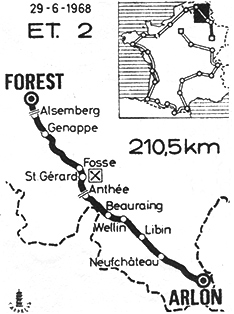- Le début d'étape est soporifique. Il ne se passe quasiment rien pendant 75 kilomètres et 36.200 km ont été couvert la première heure. Bracke est le premier à attaquer aux environs de Wellin (km 78). Il est bientôt accompagné de Schepers, Godefroot, Nuelant, Beugels, F. Blanc, Raymond, Novak & J.M. Leblanc. L'échappée ne fait pas long-feu et ils sont repris assez rapidement par le peloton. Dans la côte d'Anthée (km 114.5), Bitossi passe en tête devant Leman et Guyot. Au km 132, une autre vaine tentative de W. David, un peu avant Fosses-la-Ville et il faut attendre Tamines (km 144) pour voir à nouveau 7 hommes sortir du peloton : Van Springel, Godefroot, Bracke, Wright, Peres Frances, Janssen & Poulidor, échappée de luxe qui prend 1' d'avance vers Genappe (km 173) mais ils sont rejoints aux environs de Braine-l'Alleud (km 191) et tout est à refaire.