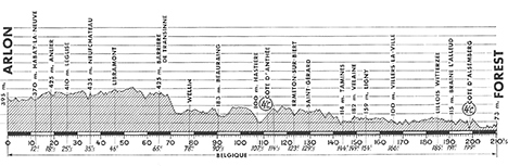 11h00 (BELGIQUE) - (Luxembourg) : Arlon / Rte d'Habay-la-Neuve (km 0) - N48 Heinsch (km 3.5) - Habay-la-Neuve (km 12) - Anlier (km 18.5) - Beheme (km 20.5) - Léglise (km 25.5) - Hamipré-Neufchâteau (km 33.5) - Verlaine - Lamouline - Saint-Pierre (km 35.5) - Libramont (km 46) - Libin (km 59.5) - Barrière de Transinne (km 65) - Redu Neupont - Halma (km 76.5) - Wellin (km 78) - (Namur) : Pondrôme (km 78.5) - N46 Carr. N47 (km 87.5) - N47 Beauraing (km 90.5) - Carr. près de Feschaux (km 96) - Menil-Saint-Blaise (km 99.5) - Carr. Blaimont (près de) km 103) - Hastière (km 107.5) - N51 Anthée (km 114.5-GPM4) - Hermeton-sur-Biert (km 123) - Saint-Gérard (km 129.5-ravitaillement) - Fosses-la-Ville (km 136.5) - Tamines (km 144) - Velaine (km 149) - Ligny (km 154) - (Hainaut) : Saind-Amand-lez-Fleurus (km 158) - Wagnelée (km 159) - (Brabant-Wallon) : Marbais (km 162.5) - Villers-la-Ville (km 166) - Genappe (km 173) - Ophain (km 188.5) - Braine-l'Alleud (km 191) - (Brabant-Flamand) : Alsemberg (km 199-GPM4) - Drogenbos (km 204.5) - (Bruxelles-Capitale) : Forest / Av. du Globe (km 210.5).