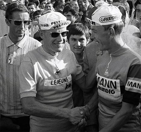 Jan Janssen en jaune et Herman Van Springel très fair-play, se serrent la main (photo Miroir du Cyclisme n° 103 juillet-août 1968).