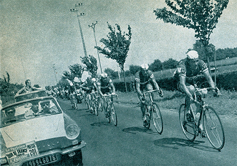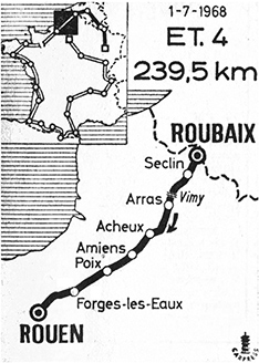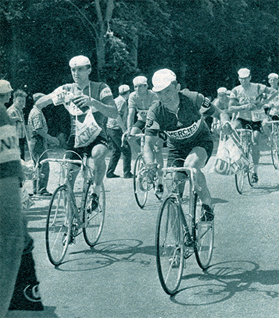 A Poix, Stablinski ravitaille et prépare son coup. Parti de Vittel avec un pied blessé, il s'est bien rétabli ! A noter que Genet, futur maillot jaune, est tombé peu avant ce ravitaillement (photo Miroir-Sprint n° 1148B du 5 juillet 1968).