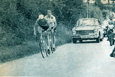 Ils resteront en tête pendant 86 kilomètres, mais finalement Leméteyer et Wright seront repris à une quarantaine de kilomètres de Lorient (photo Miroir-Sprint n° 1148B du 5 juillet 1968).