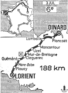 Après une grasse matinée, les coureurs s'élancent pour 188 kilomètres. Schutz est le premier attaquant. A Plancoët (km 27), Letort se détache pour embrasser les siens sur le bord de la route. Le vent de la mer pousse le peloton, l'allure est vive et à Vau Jaune (km 61.5), malgré 42 km/h de moyenne, Leméteyer et Wright prennent les devants. L'écart grandit : 2'45" à La Jubinière (km 80), 4'25" à Uzel (km 87), 6' au Poteau (km 97.5).