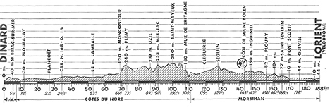 12h00 (Ille-et-Vilaine) : Dinard /rue St-Lunaire (km 0) - N786 Saint-Lunaire (km 2.5) - Saint-Briac-sur-Mer (km 5.5) - (Côtes-du-Nord) : Lancieux (km 9) - Ploubalay (km 12) - N168 La Giclais - Tregon (km 15) - N168 Carr. N786 (km 16) - St-Loumel Vieux Bourg (près de) (km 23) - Plancoët (km 27) - La Ville Oreux - N168 Carr. D16 (km 34.5) - Saint-Denoual - Saint-Guettas - N168 Carr. D52 (km 42.5) - La Doberie (km 48) - Lamballe (km 53) - Vau Jaune (km 61.5) - Moncontour (km 69) - D35 Plémy (km 73) - La-Ville-aux-Péchoux - La Jubinière près Causson (km 80) - Pignon-Blanc (km 84) - D76 Uzel (km 87) - D53 Merléac (km 91.5) - D76 Le Poteau (km 97.5) - Saint-Mayeux (km 100.5) - N167 - Mûr-de-Bretagne (km 108-sprint) - (Morbihan) : D35 Saint-Aignan (près de) (km 111) - Corboule - D18 Cléguerec (km 119-ravitaillement) - D18 Carr. N164 (km 123.5) - Séglien (km 127.5) - Guéméné-sur-Scorff (km 134) - N782 Carr. D18 (km 138.5) - Côte de Mané-Bolen (km 143-GPM4) - D18 Inguiniel (km 147) - D2 Plouay (km 156) - N169 Kerchopine - N169 Carr. D113 (km 160) - D18 Kercado (km 164) - Saint-Sévérin (km 165.5) - D26 Pont-Scorff (km 170) - D6 Queven (km 176) - D163 Carr. N165 (km 177) - Ploëmeur (km 182) - D162 Lorient / Parc des Sports (km 188).