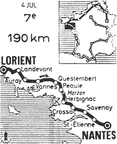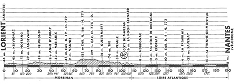 11h45 (Morbihan) : Lorient / Pl. Clémenceau - Lanester (km 0) - D194 Pont du Bonhomme (km 2.5) - D170 Kervignac (km 8) - D9 Merlevenez (km 11.5) - D33 Nostang (km 15.5) - Landevant (km 20.5) - D33 Pluvigner (km 30) - D102 Sainte-Anne d'Auray (km 39.5) - D19 Mériadec (km 44) - D19 Carr. N779 (km 52.5) - N779 Vannes (km 56-sprint) - N166 Carr. N775 (km 66.5) - N775 Carr. D1 (km 74.5) - D1 Questembert (km 83) - Tré (km 89.5) - Péaule (km 96) - N774 Côte de Marzan (km 102.5-GPM4) - N165 La-Roche-Bernard (km 105) - (Loire-Atlantique) : La-Ville-Pérotin (km 108.5) - N774 Herbignac (km 115.5-ravitaillement) - Carr. près La-Chapelle-des-Marais (km 121) - Sainte-Reine-de-Bretgane (km 125) - D4 Crossac (km 129) - D4 Carr. N773 (km 137) - Les 6-Croix (km 139) - Donges (km 143) - D100 La Tremblais (km 151.5) - N771A Savenay (km 156.5) - D17 Carr. D90 (km 162.5) - La Croix-Mazé - Saint-Étienne-de-Montluc (km 172) - L'Espérance (km 176) - D101 Nantes / Carr. des Châtaigners (km 188.5) - Nantes / Vélodrome Petit-Breton (km 190).