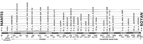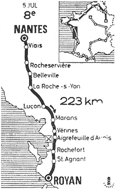 10h40 (Loire-Atlantique) : Nantes / L'île Gloriette - Rezé (km 0) - N137 Les Sorinières (km 4.5) - N178 Viais (km 9) - N137bis Le Landais - Geneston (km 16.5) - (Vendée) : La Noue-Morin (km 21.5) - Saint-Philbert-de-Bouaine (km 24.5) - Rocheservière (km 30) - Saint-Christophe - Les-Lucs-sur-Boulogne (km 41) - Belleville-sur-Vie (km 49) - La Ribotière (km 55.5) - La Roche-sur-Yon (km 62-CV) - N746 Belleplace (km 66) - La Barre (km 69.5) - Saint-Florent-des-Bois (km 74) - La Mainborgère (km 77) - Mareuil-sur-Lay (km 84) - Carr. La Frise (km 89) - Luçon (km 94) - N149 Les Quatre-Chemins (km 99) - N137 Petré (km 101) - Moreilles (km 105-sprint) - Chaillé-des-Marais (km 111) - Aisne (km 113) - Le Pont (km 114) - Le Sableau (km 115.5) - (Charente-Maritime) : Marans (km 122) - Sérigny (près de) (km 127) - N137 Carr. D112 (km 129) - D112 Longèves (km 132) - Loiré (km 134.5) - Vérines (km 137) - D107 Fontpatour (km 139) - D112 Saint-Christophe (km 143) - D112 Carr. D108 (km 144) - Aigrefeuille d'Aunis (km 146.5-ravitaillement) - N139 Puydrouard (km 149) - D112 Le Thou (km 151) - D116 Ciré d'Aunis (km 154.5) - Cabane Rouge (km 158.5) - La Croisée (km 161.5) - Breuil-Magné (km 163.5) - Rochefort-sur-Mer (km 168.5-CV) - Tonnay-Charente (près de) (km 172.5) - N137 Carr. N79 (km 175) - Pont-Saint-Clémernt (km 178) - Saint-Hypolite (km 180.5) - Carr. Les Granges (km 181.5) - Montherault (près de) (km 184.5) - Peré - Montierneuf - N733 Saint-Agnant (km 189) - N733 Villeneuve (km 192.5) - Saint-Jean-d'Angle (km 195) - La Gripperie - N133 Carr. D118 (km 199.5) - N133 Carr. D131 (km 206.5) - L'Eguille (près de) (km 210) - Fontbedeau (km 212) - N133 Carr. D14 (km 213.5) - Saint-Sulpice-de-Royan (km 215.5) - Jaffe (km 217.5) - Bernon (km 219) - Royan / Bd. Frédéric Garnier (km 223).