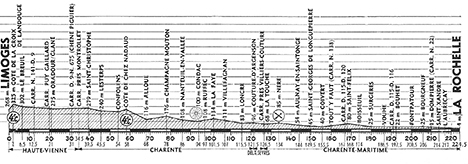 10h50 (Haute-Vienne) : Limoges (km 0) - N141 La Croix de Landouge (km 2-GPM4) - Le Breuil (km 6.5) - Beauvallet - N141 Carr. D9 (km 12.5) - D9 Carr. D28 (km 15) - Carr. Puy Gaillard (km 20) - D3 Oradour-sur-Glane (km 21) - D9 La Fauvette - D9 Carr. N675 Chêne-Piguier (km 31) - (Charente) : D82 Carr. près de Montrollet (km 34.5) - Saint-Christophe (km 39.5) - Lesterps (km 45.5) - D30 Confolens (km 54) - Côte de Chez-Nadaud (km 58-GPM4) - N148 - N740 - Lasfont - Alloué (km 68) - La Réchaudie - Chapagne-Mouton (km 78-CV) - Nanteuil-en-Vallée (km 86) - Condac (km 94-sprint) - Ruffec (km 97) - Veillemorte - La Faye (km 101.5) - Villefagnan (km 107) - D9 Brettes - N737 Longré (km 115.5) - (Deux-Sèvres) : D52e Couture-d'Argenson (km 121.5) - (Charente-Maritime) : D130 Carr. près de Villiers-Couture (km 126.5) - La Touche (km 127) - Romazières (km 128.5) - Les Eduts (près de) (km 131.5) - Néré (km 134-ravitaillement) - D133 Aulnay-en-Saintonge (km 144) - D121 Saint-Georges-de-Longuepierre (km 149.5) - Dampierre-sur-Boutonne (km 152.5) - D115 Coivert (km 155.5) - Tout-y-Faut / Carr. N138 (km 160) - La Cavalerie - D115 Carr. D120 (km 167) - D115 Saint-Félix (km 168) - Boisseuil (km 174) - D111 Surgères (km 180-CV) - D115 Vouhé (km 186.5) - D108 - D115 Carr. D116 (km 191) - D116 Bouhé (km 192.5) - D107 Fraise - Fontpatour (km 200.5) - Bourgneuf (km 206) - Carr. Belle-Croix (km 208.5) - Dompierre (km 210) - Saint-Xandre (km 214) - L'Aubreçay (km 217) - V.O 1 - La Rochelle (km 224.5).